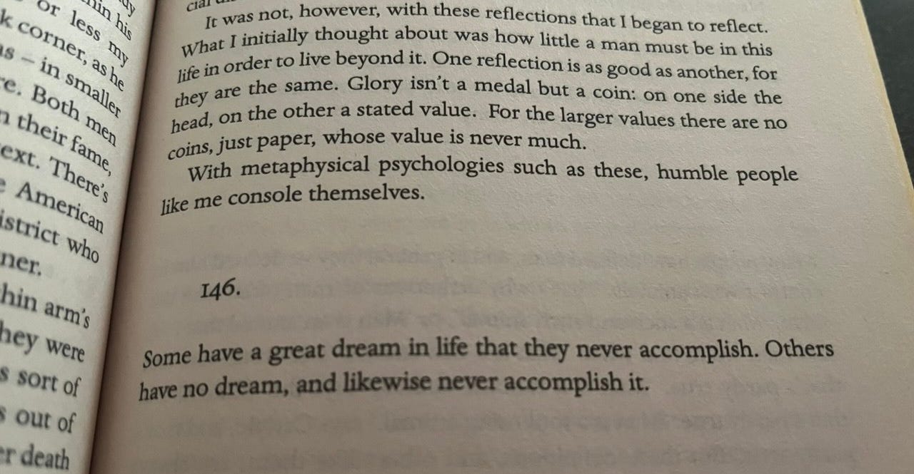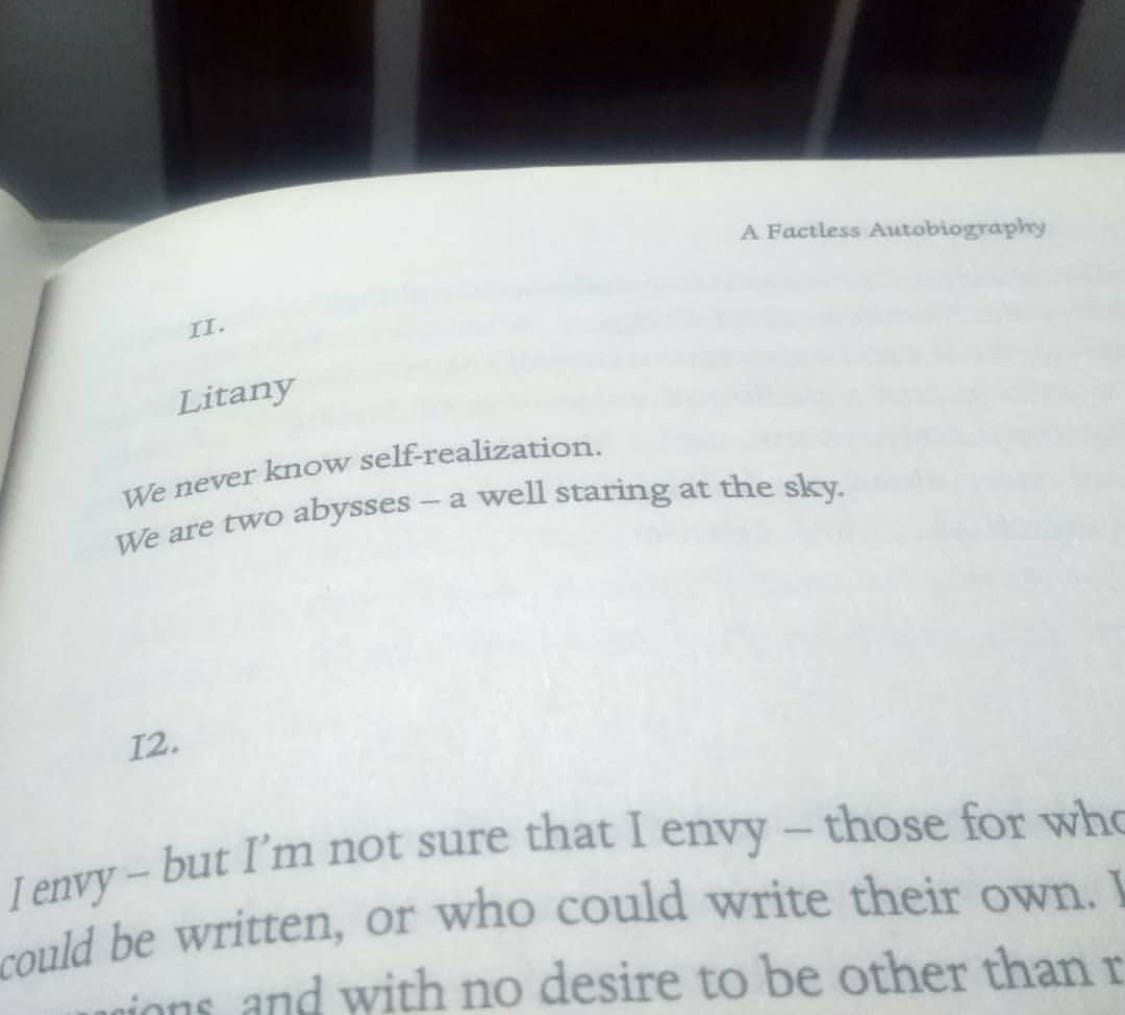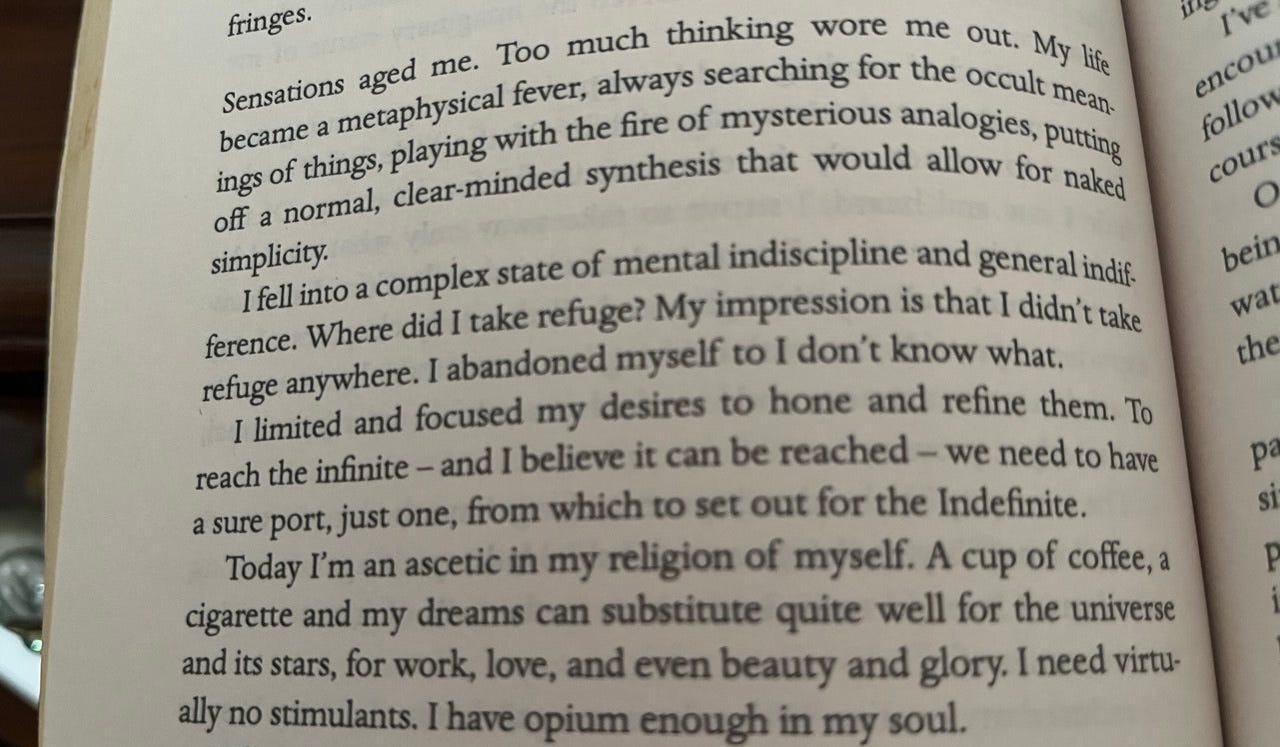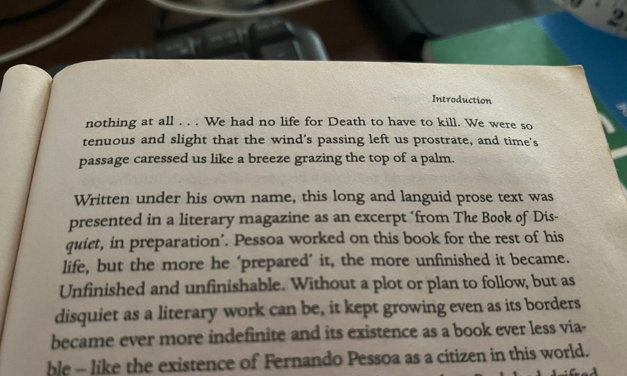 Nowadays, I begin every morning by mulling over passages from Pessoa’s ‘The Book of Disquiet’. I don’t know when it became something I do almost every day, and now it has the makings of an irreligious rite. I shall not share where I perform this rite; let us just say that contemplating on all kinds of voids has all sorts of salutary effects.